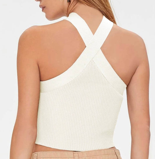 White Ribbed Knit Criss Cross Halter Neck Tank Top
